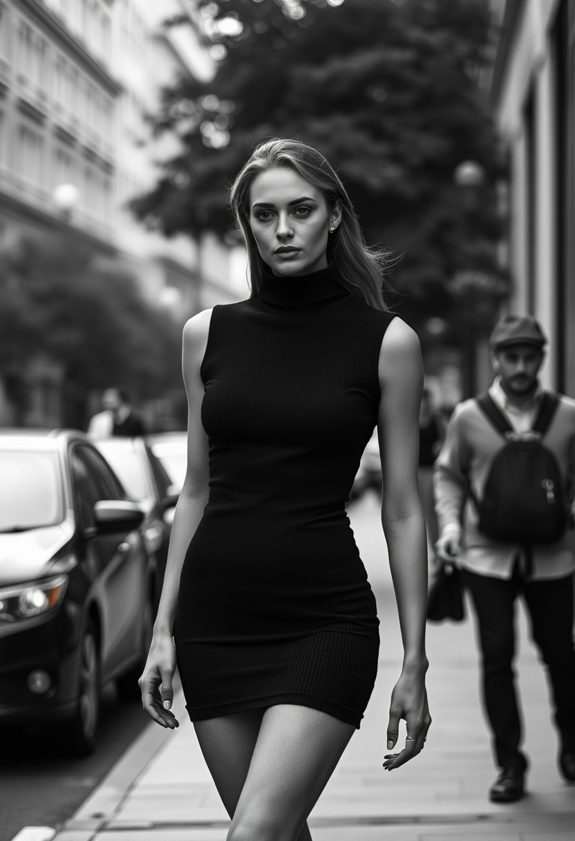 black and white photography, Ilford HP5 Plus, shallow depth of field, Lubitel 2, a beautiful woman in a skintight short black turtleneck sleeveless ribbed dress, walking down the street, fashion editorial