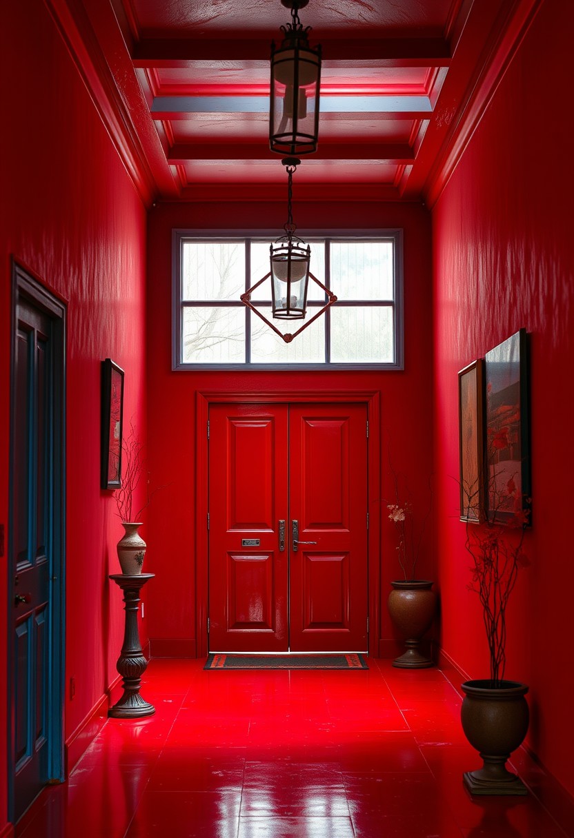 The most noticeable aspect to this entryway is the startling overload of redness. The walls, ceiling and floor are all a striking red -- the exact color of human blood. The richness and choice of color is in stark contrast to the sky blue that the entire outside of the building is decorated with. The serenity of the outside is all but forgotten. Beyond the vibrant color the decor is very subdued, and very sparse.