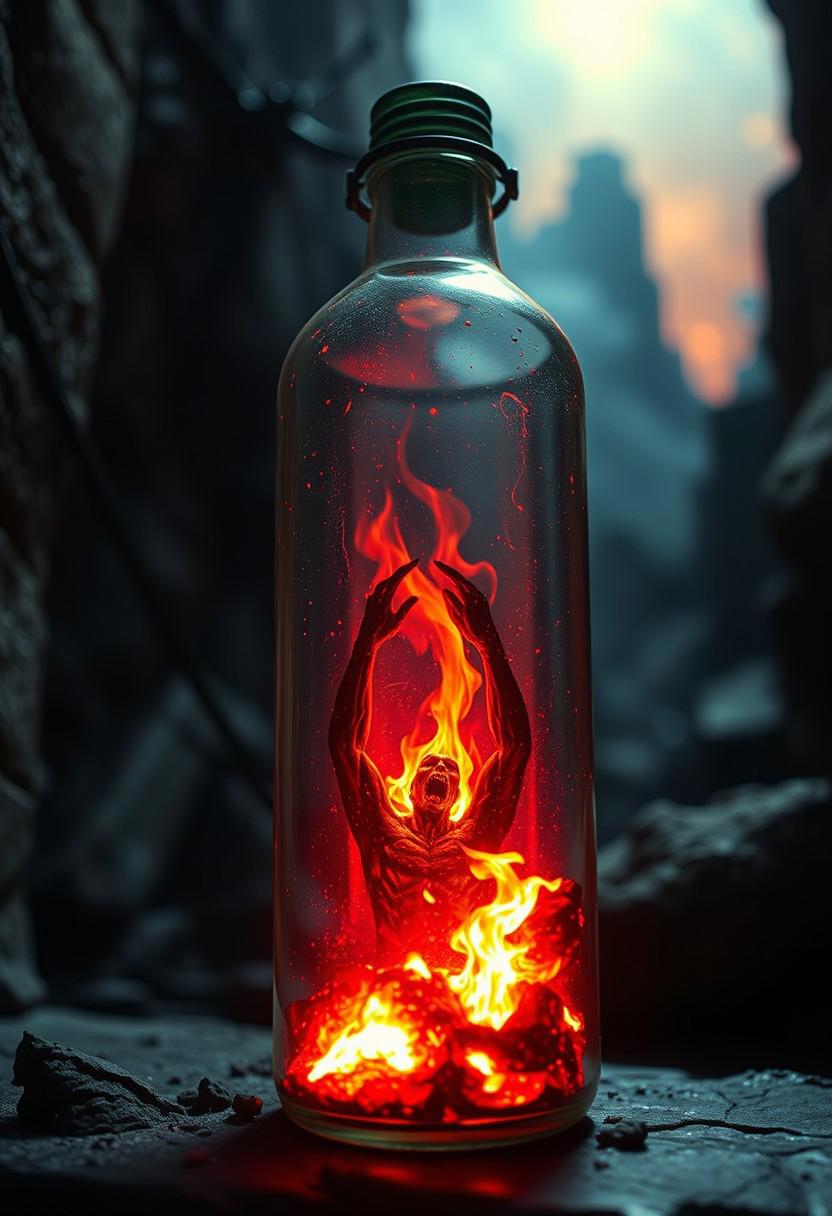 (By Larry Carlson:100), hell inside a bottle, (fantasy background details:1.45), dof, realistic details, demonic aesthetic, (style Jeremy Geddes:1.35), (Harsh lighting:1.4), cinematic, dramatic, raw, rating_safe, unique perspective