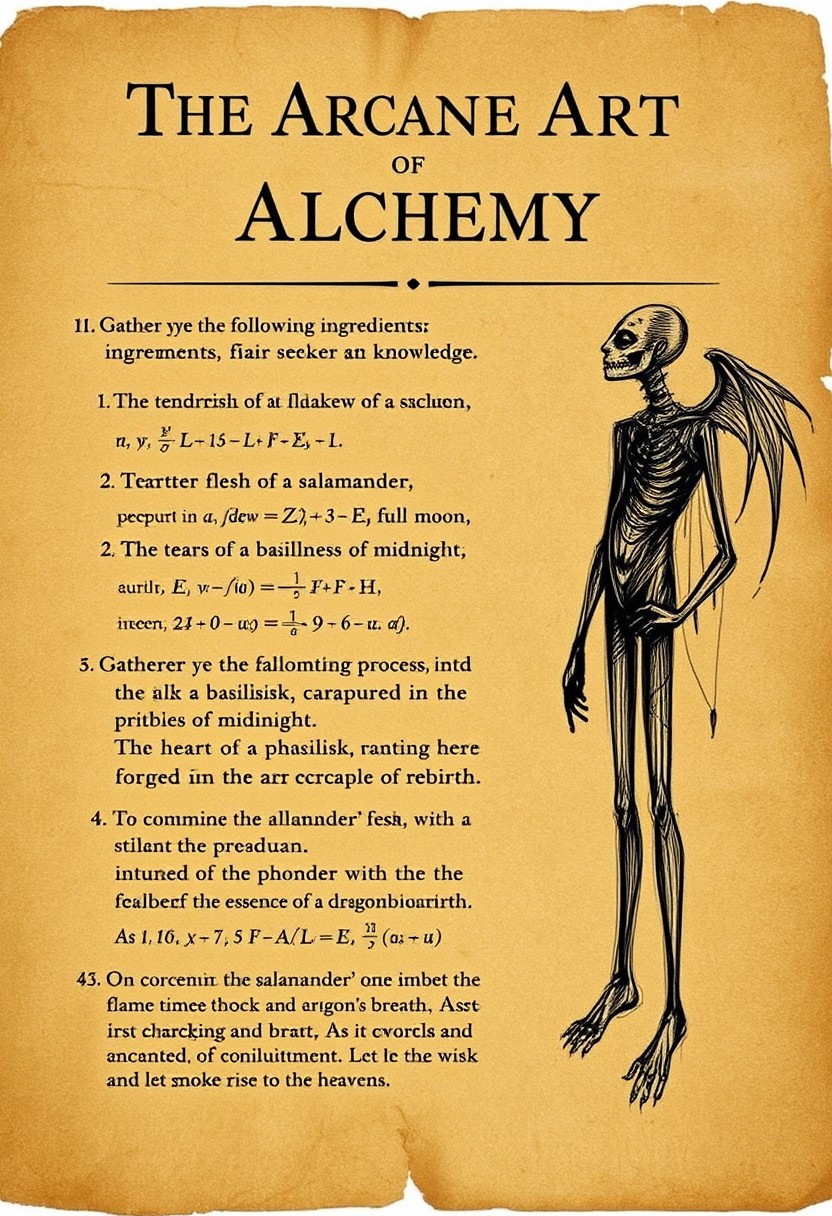 A old brown paper with the title "The Arcane Art of Alchemy" with lots of mathematical equations to the right side is a rough charcoal scetch of a man without legs and to the left is the following text Gather ye the following ingredients, fair seeker of knowledge: the tender flesh of a salamander, steeped in the dew of a full moon; the tears of a basilisk, captured in the stillness of midnight; and the heart of a phoenix, forged in the crucible of rebirth. To commence the alchemical process, one must first ignite the salamander's flesh with a flame imbued with the essence of a dragon's breath. As it crackles and burns, chant the words of enchantment, Solis et Lunae Coniunctio, and let the smoke rise to the heavens.
