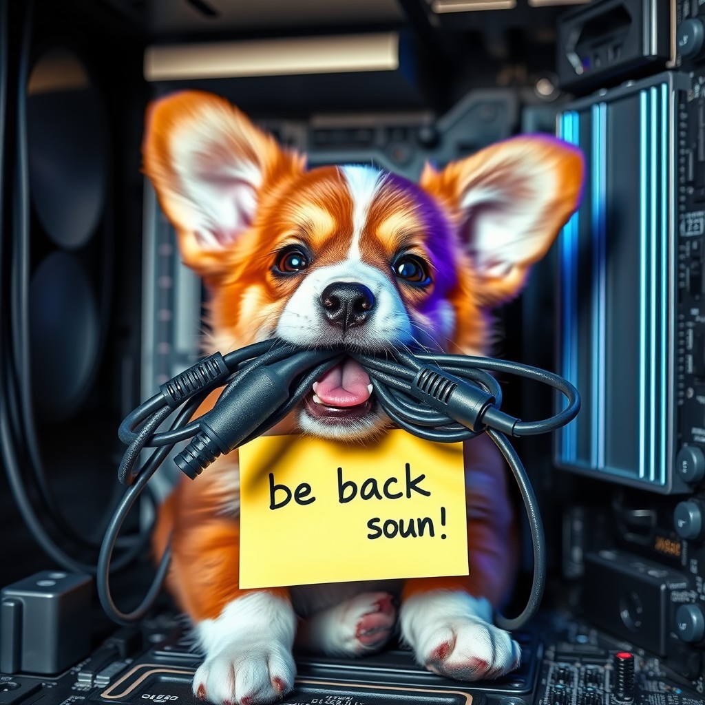semirealistic, a cute/charming corgi puppy with multiple unplugged computer cords in its mouth, inside a computer motherboard. THE message "be back soon" written on a yellow sticky note, detailed mirroring horizon, wining award digital art, hight detailed, Insane resolution. Insane details. Masterpiece. 32k resolution. casting shadow style, cucoloris patterned illumination, cinematic composition and lighting. Very detailed.