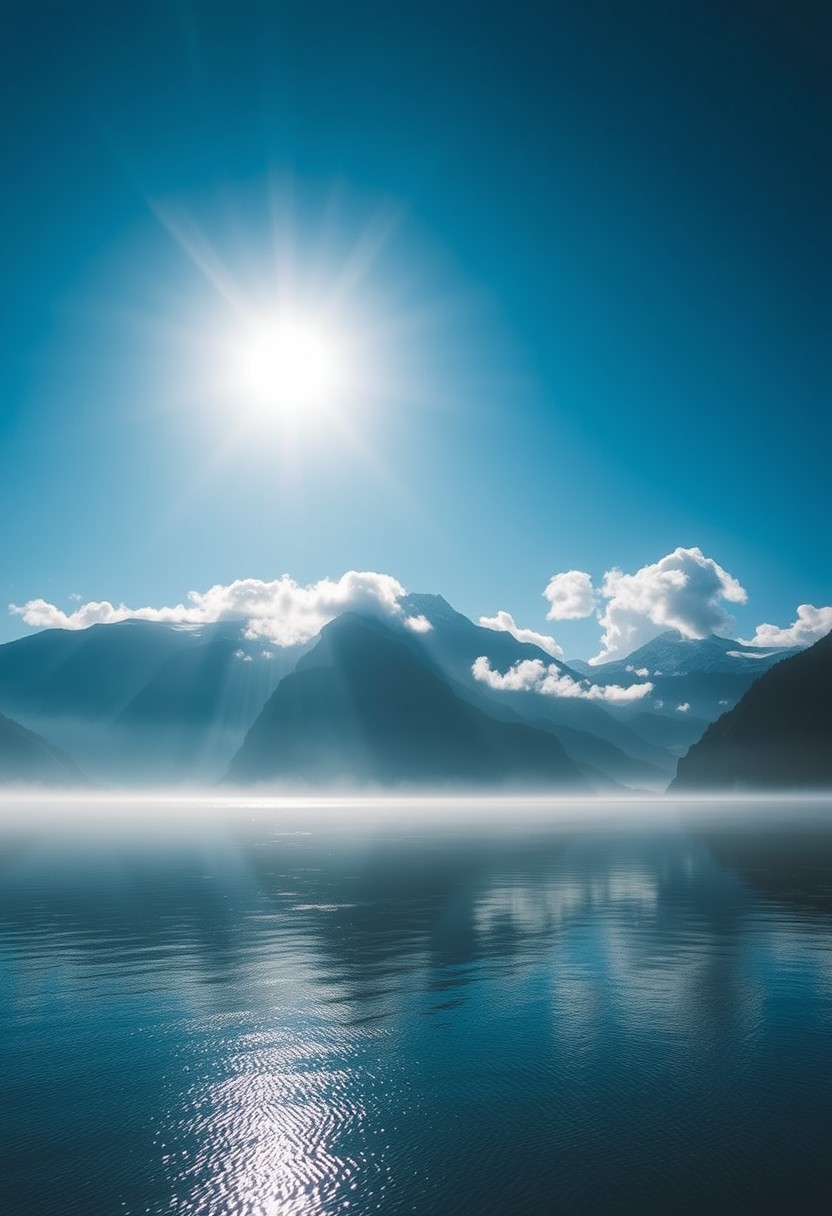 A serene landscape of a sparkling lake, gentle clouds drifting in a bright blue sky, majestic mountain peaks emerging from the mist, vibrant colors, reflective water surface, tranquil atmosphere, high detail. highly detailed and hyper realistic photo, by Alena Aenami , by Archibald Thorburn , by Daniele Afferni , in the style of monochromatic silhouette reflection, limited dark palette, unusual dark colors, faded colors, atmospheric haze, highly dramatic cinematic lighting, motion blur, film grain, professional, excellent composition, finest details, maximized details, ultimate detail level, masterpiece, best quality