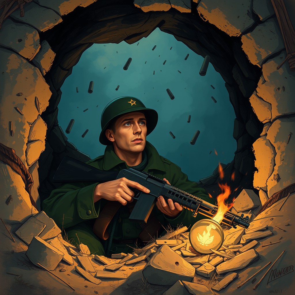 illustration of a soldier in a foxhole holding a rifle, looking tired and weary, with artillery rounds dropping around, detailed, dramatic lighting, emotional intensity, cinematic atmosphere, high resolution, war theme, realistic style, by John Singer Sargent and Kev Walker