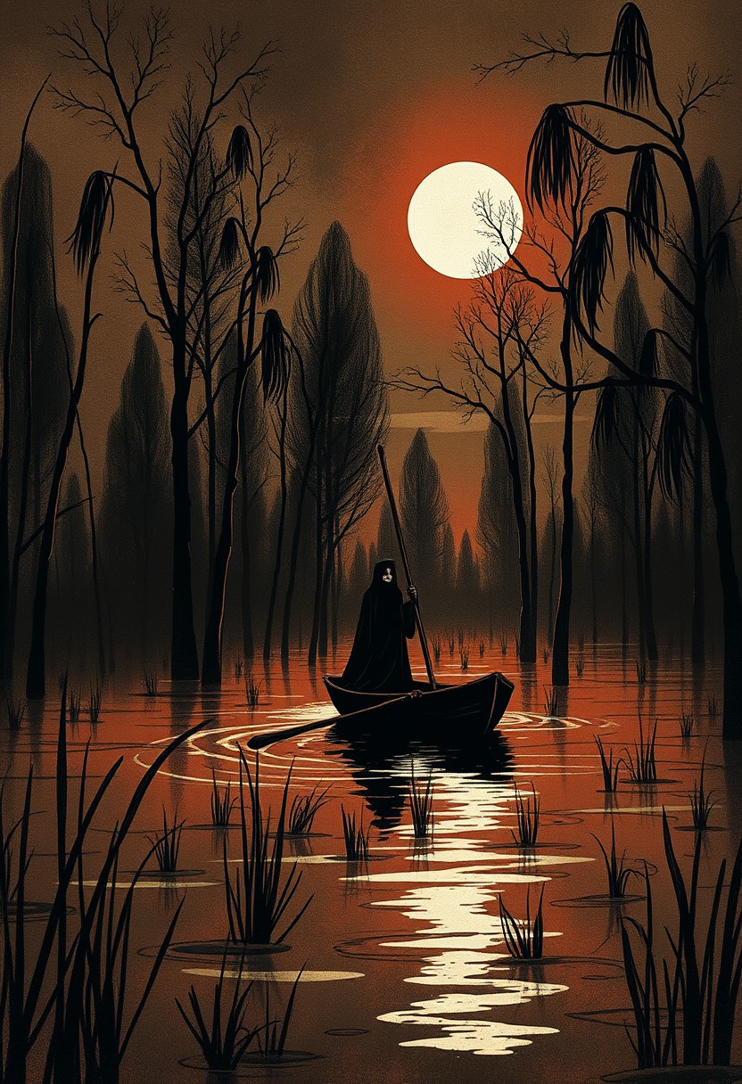 linquivera, Ink illustration, (anime:0.5), brown tones, aged black red paper, inkpunk, moonlight,surreal, a ghost standing on a boat in swampy wetlands, (at a distance), Will-o'-the-wisp, moonlit, lonely, solitude, windy, tall trees, willows, willowy, OverallDetail, extremely detailed, UHD,(long exposure , dystopian but extremely beautiful:1.4),<lora:- SDXL - letitflrsh_let_it_flourish_V1.0:0.8> ,<lora:Cute_Collectible:1>, <lora:XL_boss_battle:0.6> <lora:add-detail-xl:1>, <lora:Concept Art Twilight Style SDXL_LoRA_Pony Diffusion V6 XL:1>, <lora:MJ52:1>