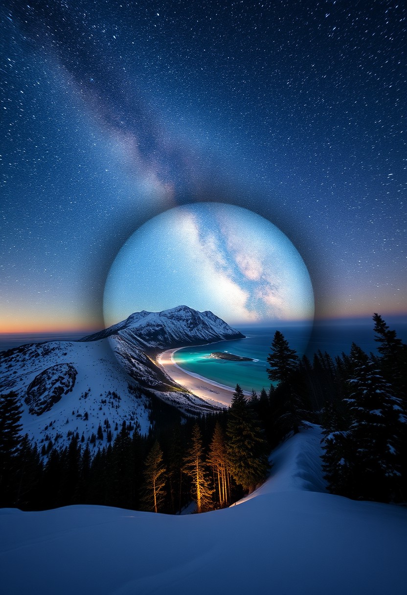 Time lapse photo of the night sky over a cold snowy mountain with a double exposure in the shape of a keyhole showing tropical beaches