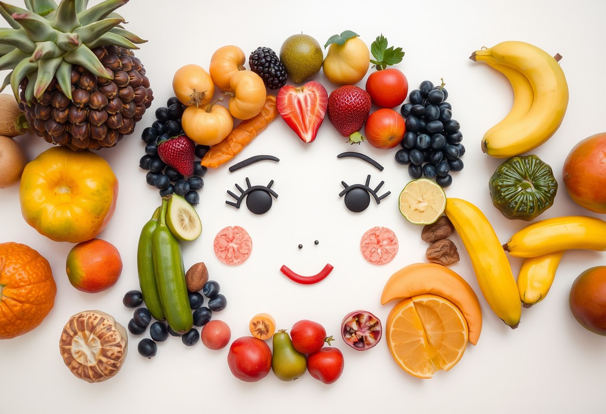 Various types of fruits are placed on a table, where the overall pattern is forming a cute girl’s face in an abstract style.