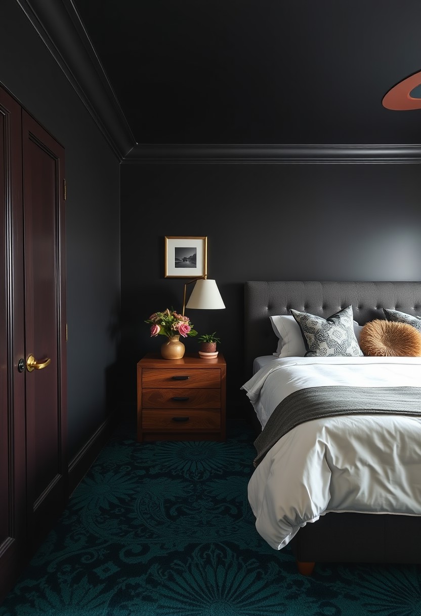 an eclectic style bedroom, black walls, contemporary patterns, teal carpet with intricate detail, wooden nightstand and king sized bed, winning, sharp focus, original, flux-style