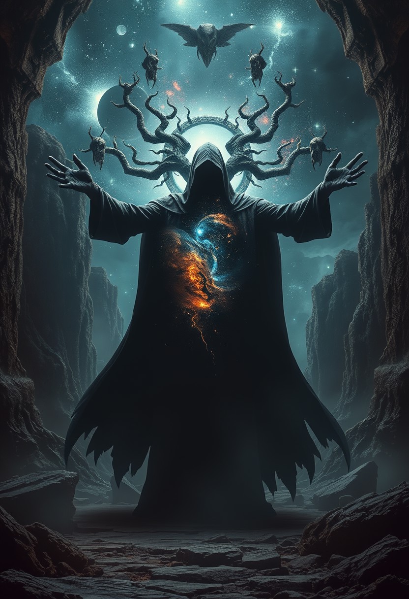 A universe inside a dark cloaked figure within mysterious landscape in an unfathomable realm of fantastic creation inhabited by ancient shadows of a forgotten time beyond the gate of the gateless gate where life is limitless, light is shadow and shadow is light, eerie sense, horror, spark of the beginning, existence and nonexistence at once, ethereal, outstretched arms, behold the end of the beginning, inglorious glory to the dark one, betrayal of the ancient order, beware the 7headed beast, destroyer of the old ways, bearer of the unbearable, nightmarish, archaic runes, tree aging backwards, breath of the gods, ruins of a place unimagined, extreme intricate detail, photorealistic, beyond epic scene, fate discarded