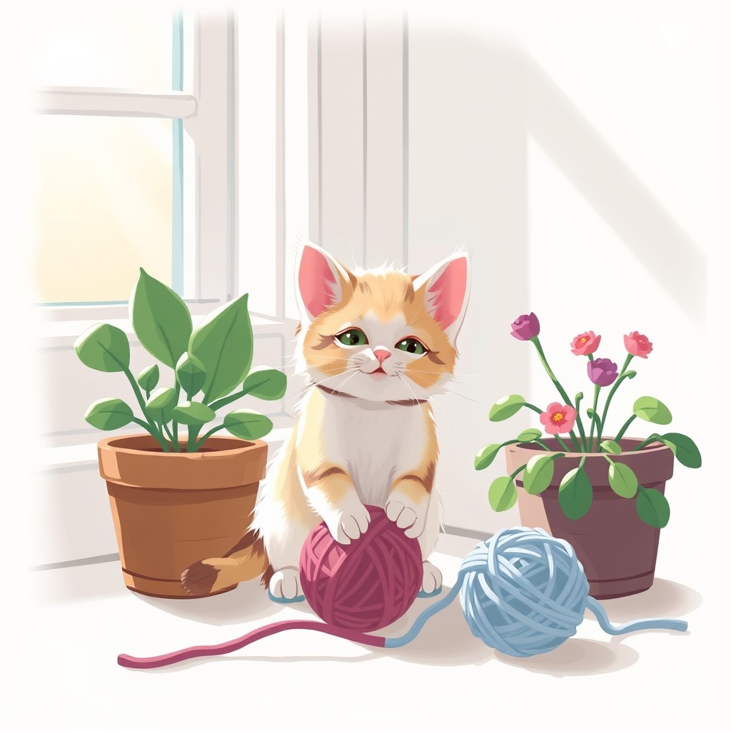 1 kitten. meowing. feeding. day light. window. plants. Ball of yarn.