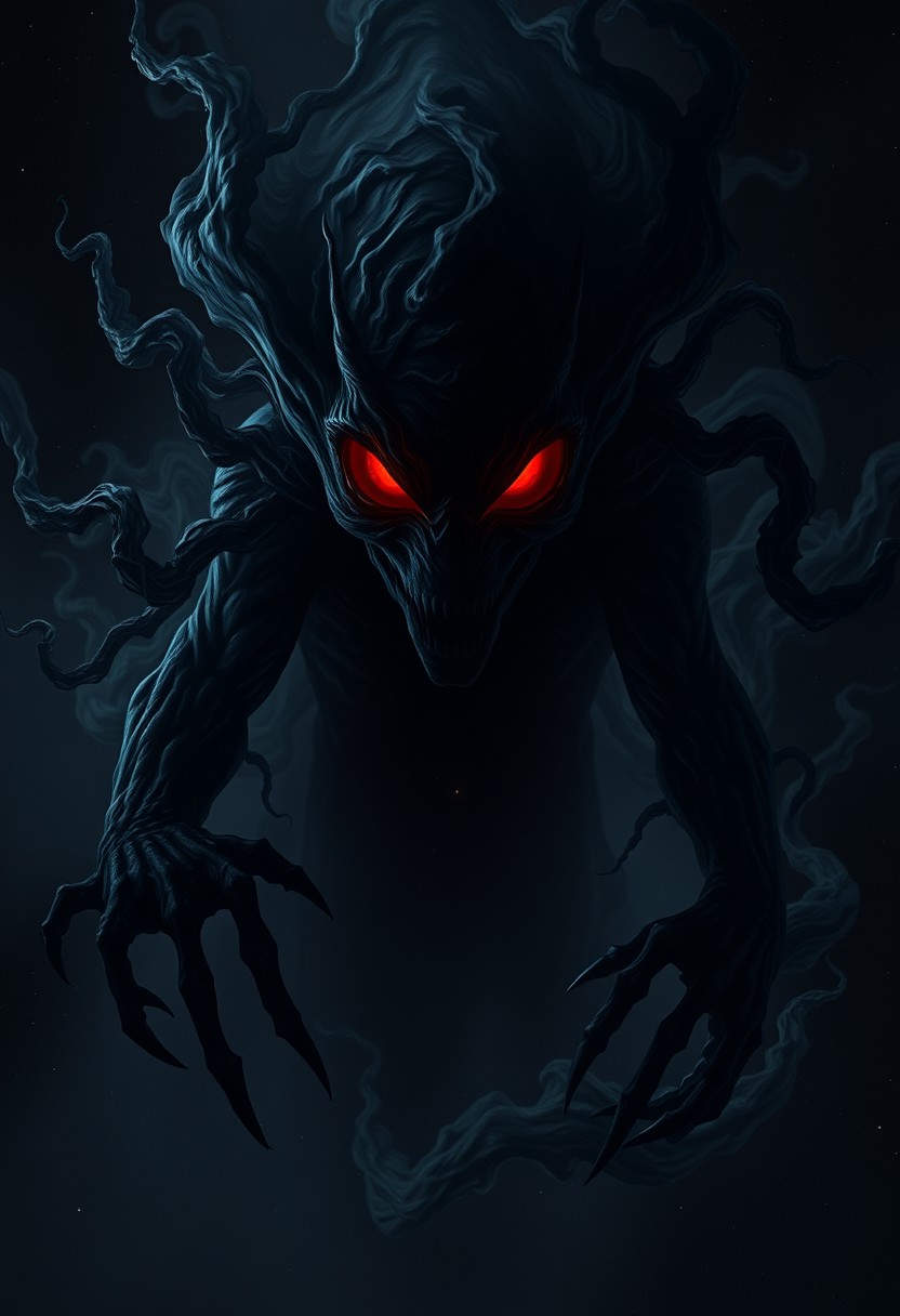 "Hyper-realistic depiction of a shadowy creature, its presence warping the fabric of reality around it. The creature's form is shrouded in darkness, with tendrils of shadowy energy snaking out from its body like living darkness. The air around it appears to ripple and distort, as if reality itself is bending to accommodate its presence. The background is a deep, inky black, with hints of stars and galaxies visible through the distortions. The creature's face is a void of pure darkness, with no discernible features except for two glowing red orbs that seem to burn with an otherworldly energy. Style: extremely detailed, hyper-realistic, and mind-bendingly surreal, with a focus on capturing the eerie, unsettling atmosphere of a reality-bending entity."