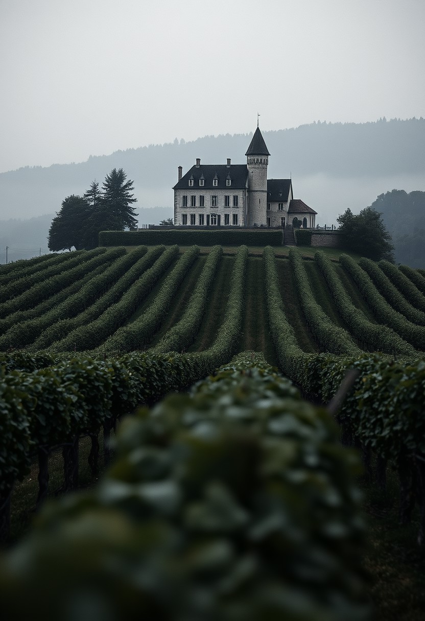 A sprawling vineyard, with a rustic chateau overlooking the grape-laden vines. highly detailed and hyper realistic photo, by Alena Aenami , by Archibald Thorburn , by Daniele Afferni , in the style of monochromatic silhouette reflection, limited dark palette, unusual dark colors, faded colors, atmospheric haze, highly dramatic cinematic lighting, motion blur, film grain, professional, excellent composition, finest details, maximized details, ultimate detail level, masterpiece, best quality
