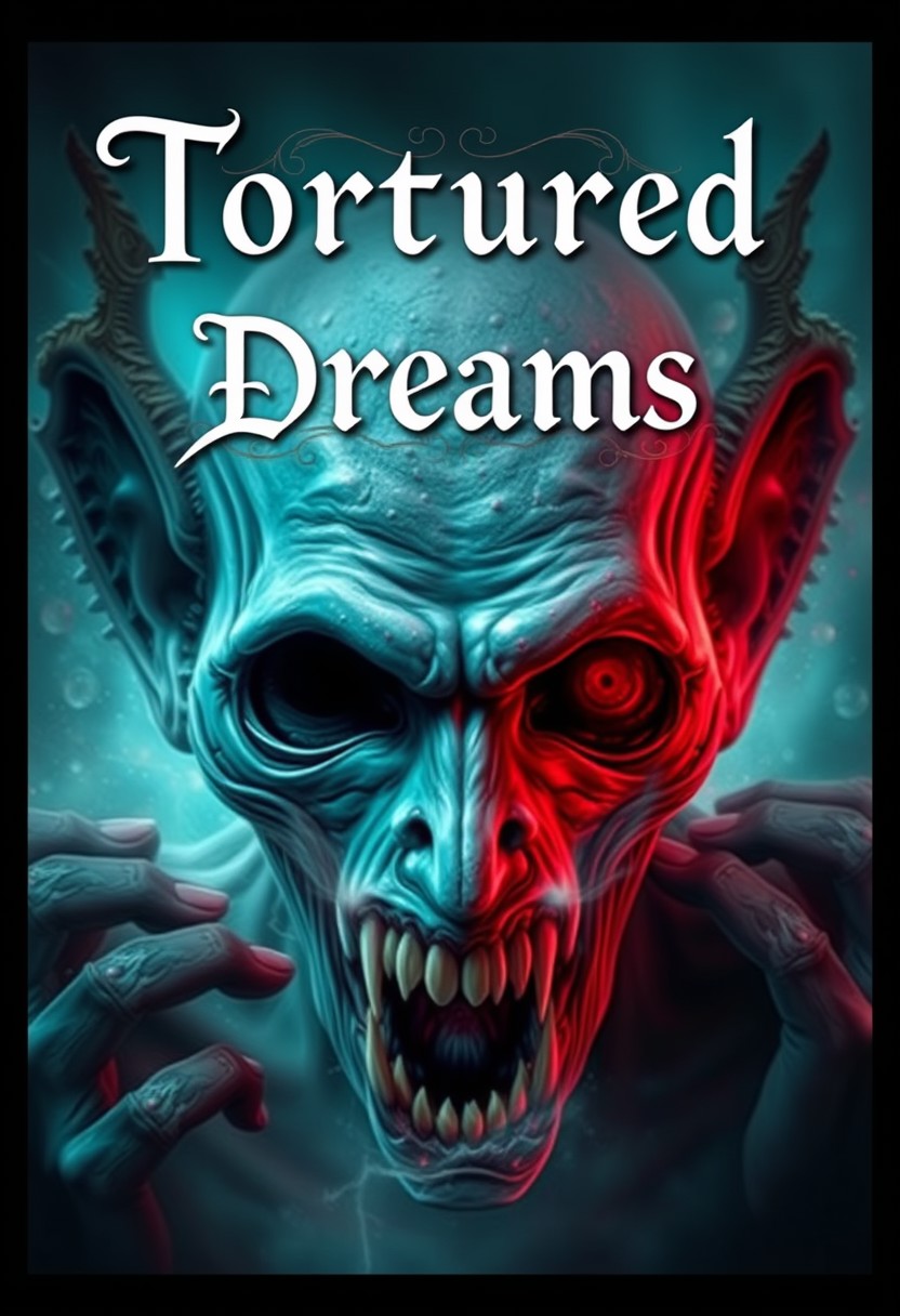 A vivid digital art piece depicting the dreams of a schizophrenic, scary surreal image, written above the main focus of the image in elegant filigree and calligraphy lettering are the words "Tortured Dreams"