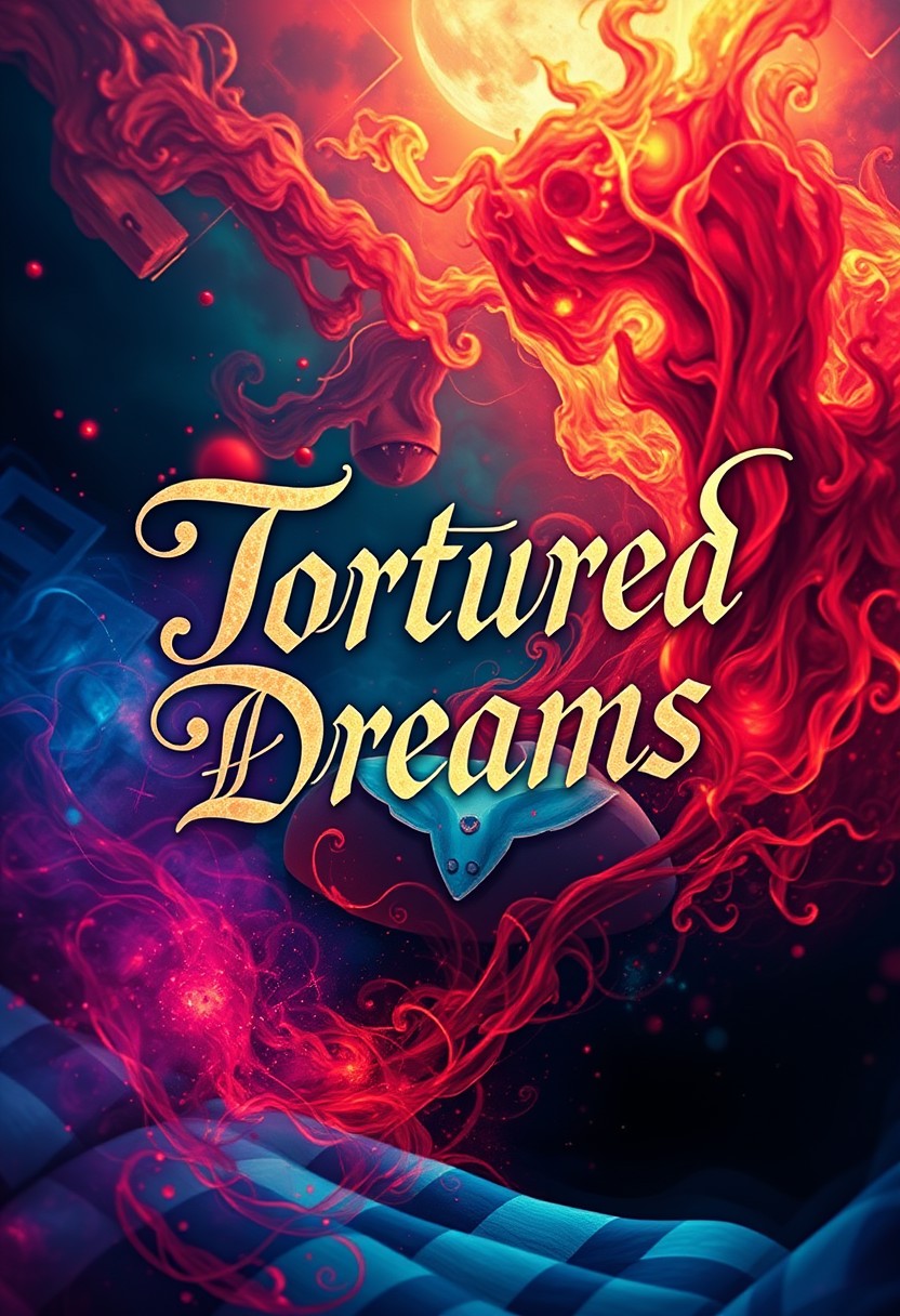 A vivid digital art piece depicting the dreams of a schizophrenic, written above the main focus of the image in bleeding elegant calligraphy lettering are the words "Tortured Dreams"