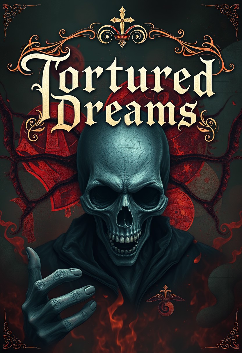 A vivid digital art piece depicting the dreams of a schizophrenic, scary surreal image, written above the main focus of the image in elegant filigree and calligraphy lettering are the words "Tortured Dreams"