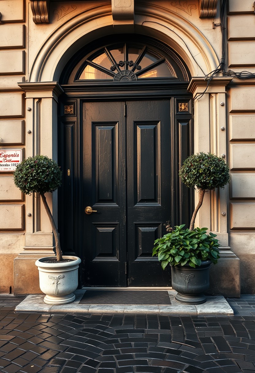A beautifully lit and composed professional high resolution photograph of a grand Parisian doorway, heavily patinated and chipped black door, wet cobblestones, early morning light, sunrise after the rain, weathered bricks and wood, fine details of doorbell wiring drain pipes, large potted plants guard the door, Boulevard Saint-Germain,
