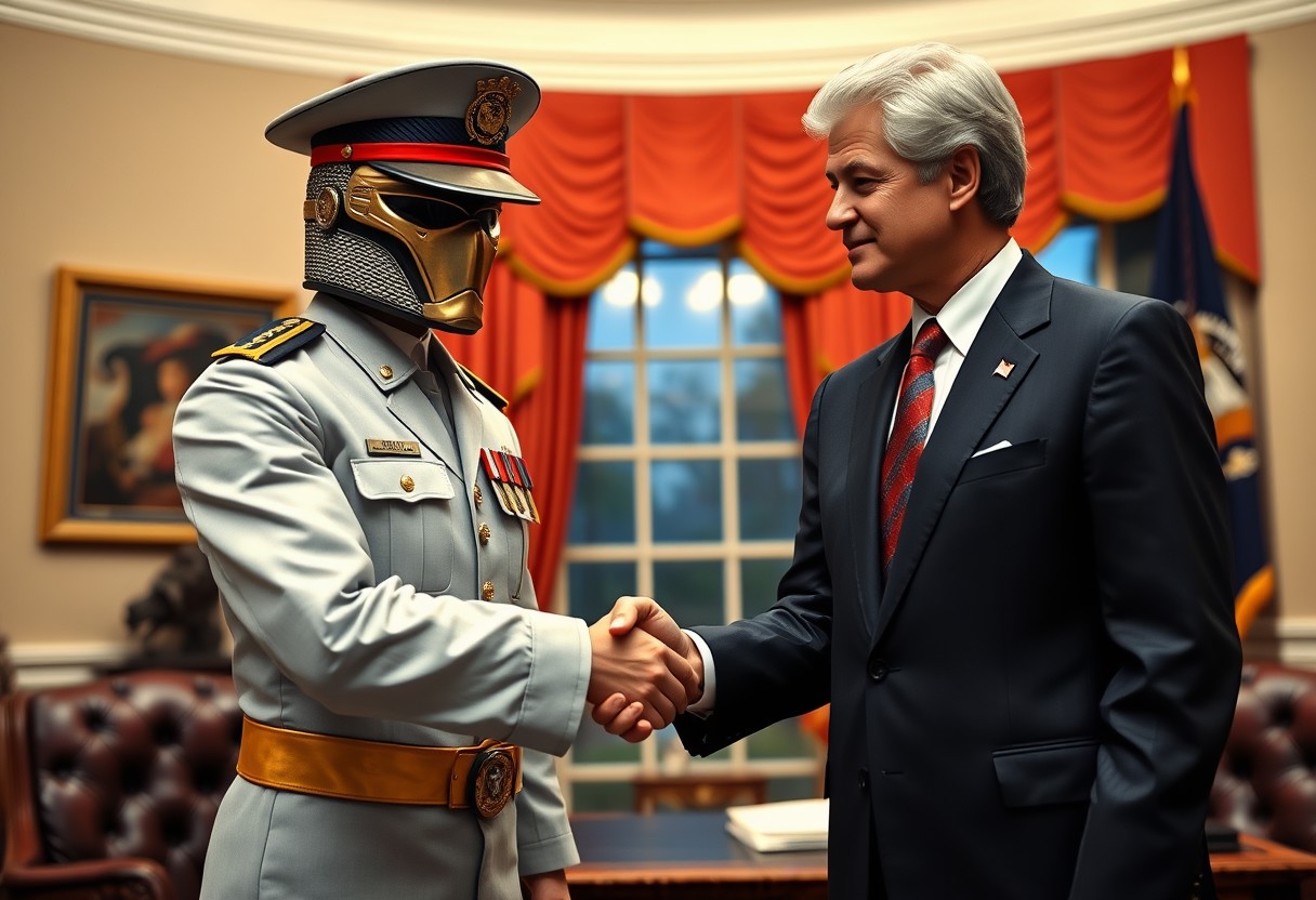 cobra commander in an immaculate military dress uniform posing for photo shaking hands with president clinton of the united states in sharp suit inside the oval office, real photograph, gi joe, photorealistic, correct hands, correct fingers, presidential seal, vote button, campaign photo, election, elegant scene