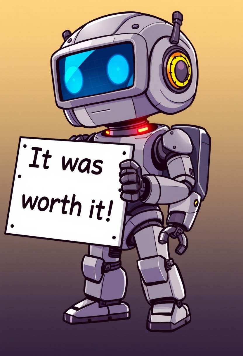 Robot chibi holding a sign that says "It was worth it"