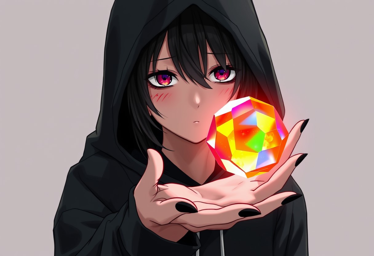 Tomoko Kurokiin in a black hoodie with a red distinct line drawn with make up under her eyes. Depressed looking. Full body picture. She has her hand out with floating rainbow orb with many sides that shines at the viewer a little above her palm. The orb has a very angular and rough surface, it looks like a crystal almost. Her hand has black painted nails that are medium length almond shape.