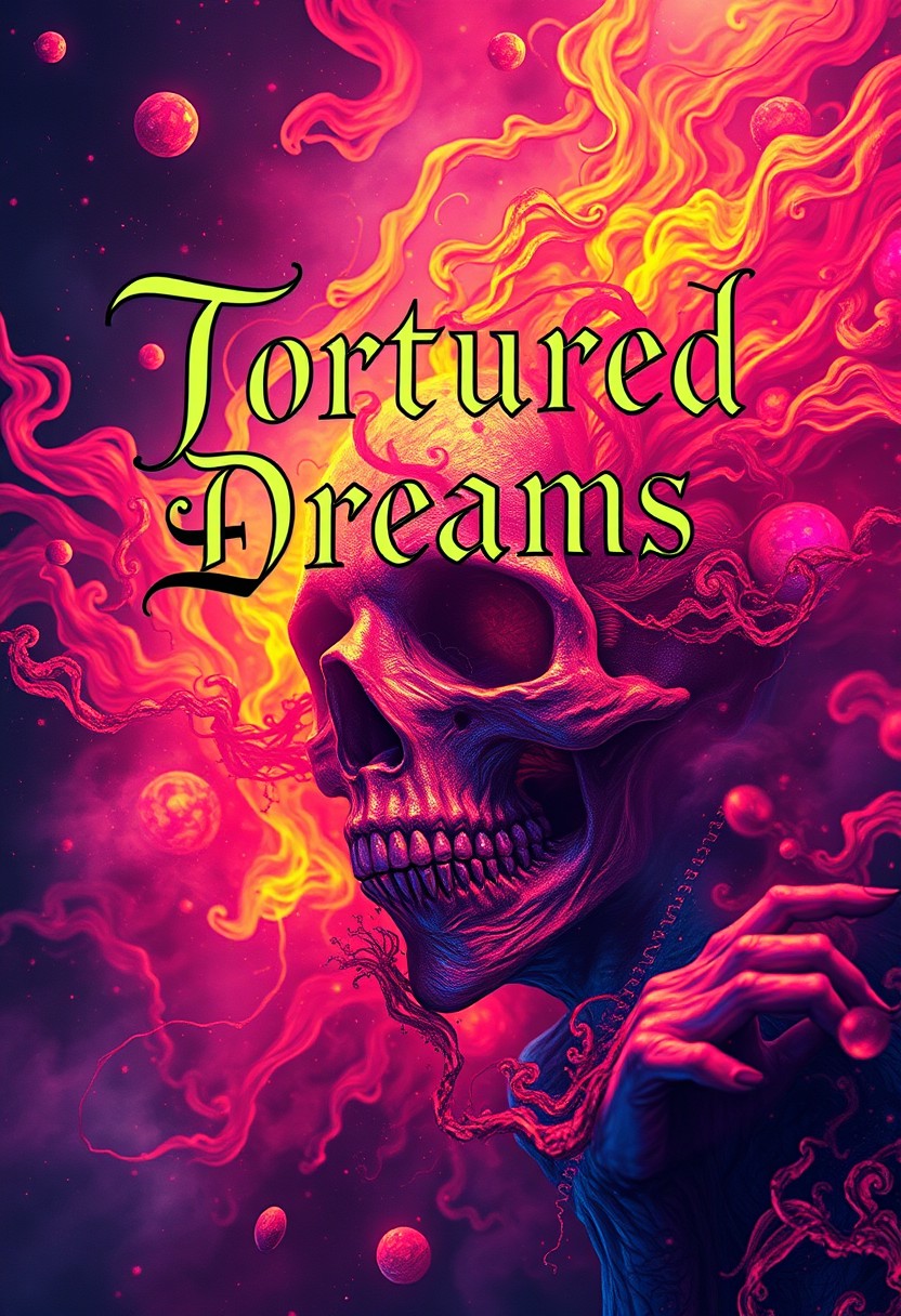A vivid color digital art piece with unearthed glow and subsurface scattering of neon colors, depicting the dreams of a schizophrenic, chaotic, surreal image, written above the main focus of the image in elegant filigree and calligraphy lettering are the words "Tortured Dreams"