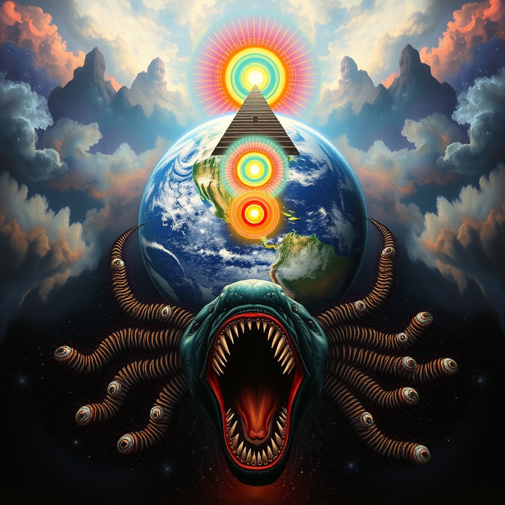 Native american art, best quality, ultra hi res, buddhist thangka painting, planet earth covered by fog of war, rain of sorrow, fire of hatred, blizzard of ignorance. Within the planet four vortexes of multicolored light spiral inward towards the core, the light of the beloved, the light of the warrior, the light of the guardian, the light of the healer. On the southern pole the illuminati erect a profane upside-down pyramid, its zenith reaching down into a gaping mouth. Below the planet is a ravenous superpredator with an open toothed maw and hundreds of tentatcles covered with eyes reaching upwards straining to consume the earth, radial symetry, abstract, emotional