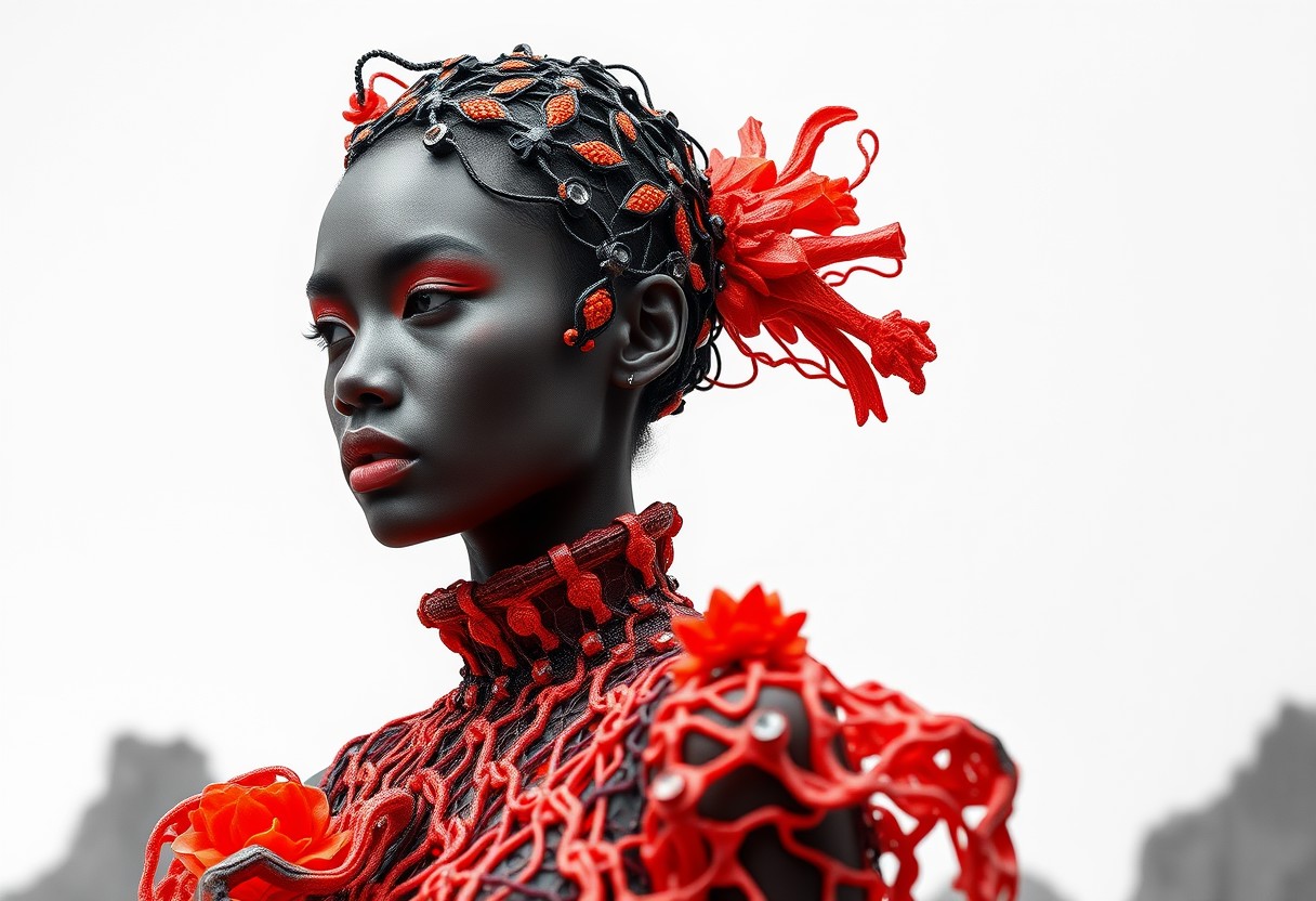 Art Direction for a poster. 8w Create high-fashion with an Android model. image inspired by both volcanic lava and natural crystals, Generate visuals of couture garments with vibrant colours, featuring intricate lattice structures crafted using 3D printing techniques, monochromatic background, and avant-garde aesthetic.