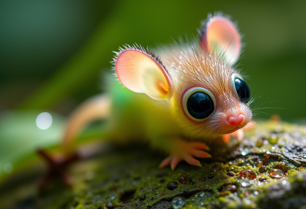 furry little translucent mammal in a rain forest zoomed in, rainbow of light reflection off dew, green and vivid colors, wild fog, large eyes, transparent body, similar to jelly fish