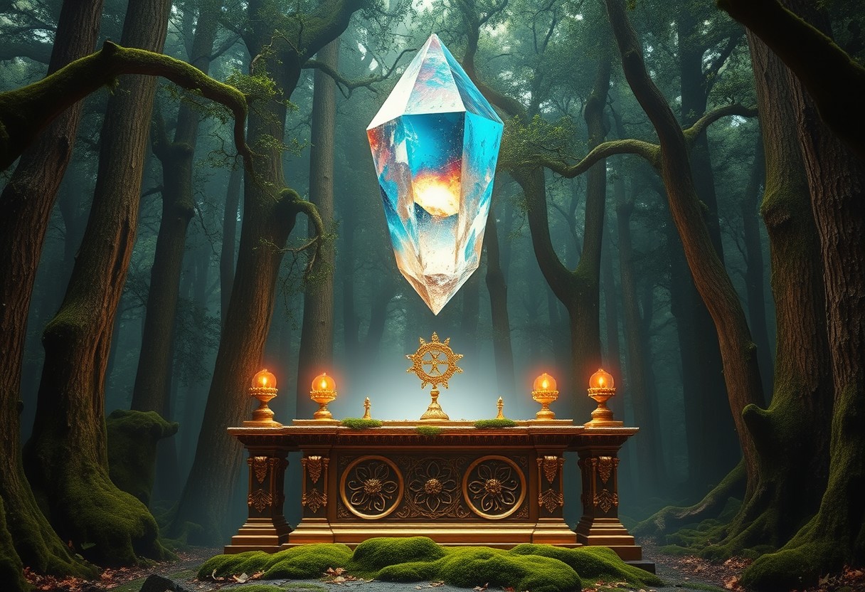 A big shimmering multicolored crystal floating above an ancient, moss-covered gold altar enchanted magical forest. glowing trees
