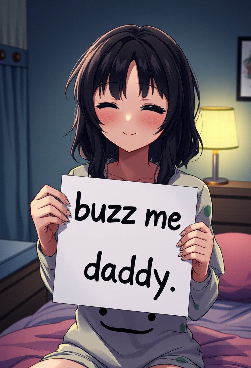 1girl, anime femboy holding a sign with text "buzz me daddy", solo, long hair, expressive eyes, dark eyeshadow, detailed skin, detailed face, perfect face, closed eyes, short wavy hair, smile, black hair, casual frog pajama, bedroom, illustration, perfect composition, dramatic lighting, film grain, highly dramatic background, cinematic film still, very aesthetic, (intricate details, (incredibly detailed), high detail, ultra-detailed), (hyperdetailed), (soft focus:1.1), absurdres, (hires textures), (4k), (masterpiece, best quality)