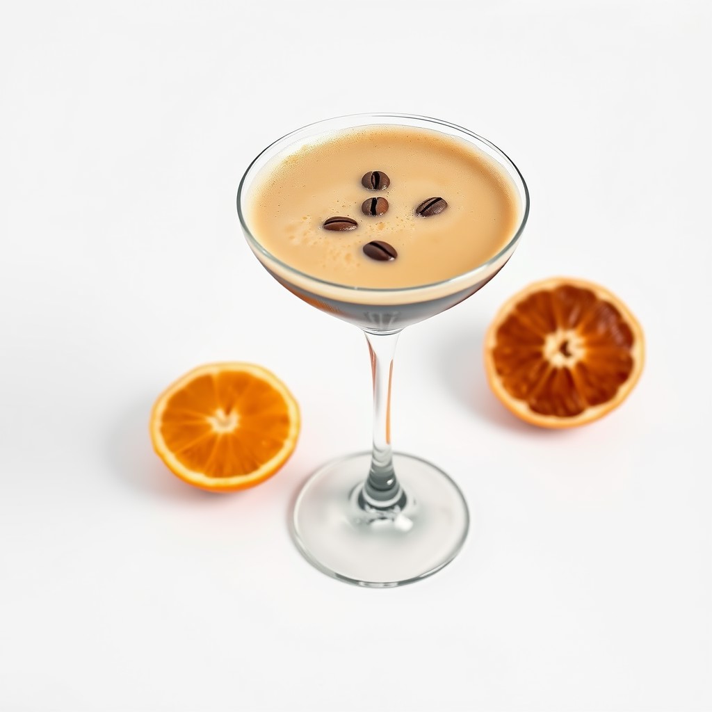 simple product Photography image on a plain, blank, pure 100% bright white background of a foamy espresso martini in a large coupe glass and 3 floating coffee beans as garnish. and cut orange beside it. zoomed out.