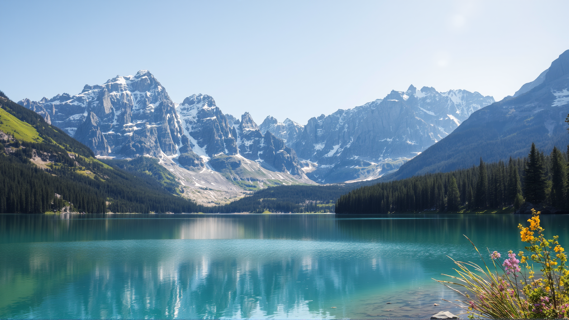 lake, summer in close, mountains with snow picks in far, best HDR photo, good sharpness