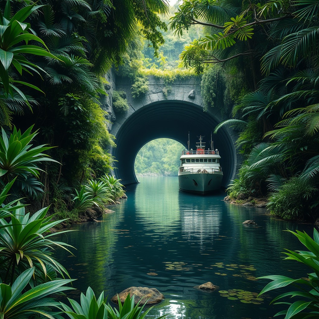 a beautiful water ship tunnel entrance conquered by green jungle vegetation, profesional photography, high resolution, fines details of plants, ultra realistic day scene