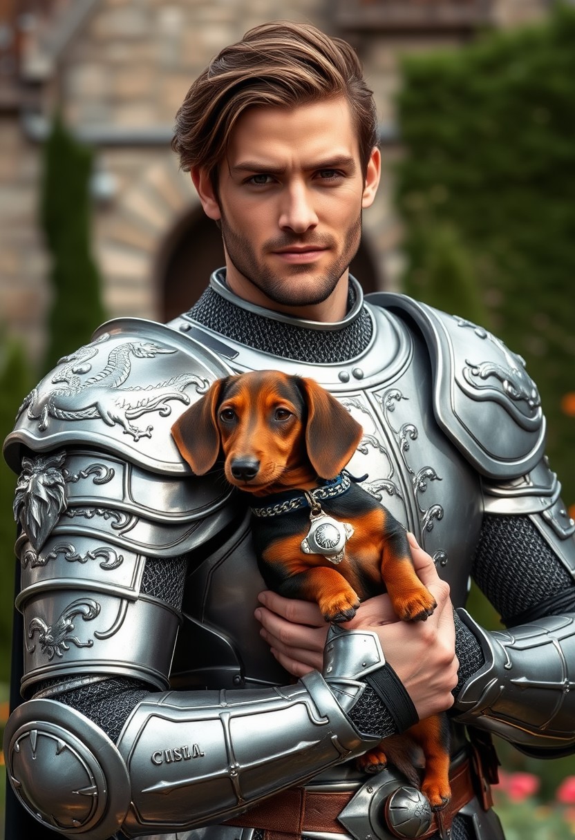 Beautiful muscular brown-haired man in full armor, slight smile, photograph style, dragon-patterned armor, silver armor, chainmail joints, holding the cutest dachshund puppy, castle garden background