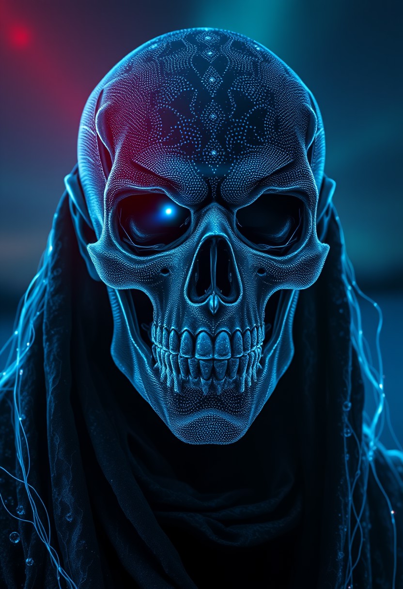 A symmetric portrait of a male, evil frozen Skeletor, features dissolving into frozen magic thin, luminescent blue lines. Weighted Voronoi stippling and laser caustics create a network, transitioning from hyperrealistic detail to abstract, quantum-inspired forms. Ethereal hues blend, evoking existential transition and mystery. Close-up on face, evil skull partially visible. Set against a twilight arctic backdrop, icy winds ripple through his tattered robes. Rendered in a fusion of photorealism and digital surrealism, the scene is illuminated by ghostly Northern Lights. Emphasis on cold, menacing atmosphere, invoking Nordic myths