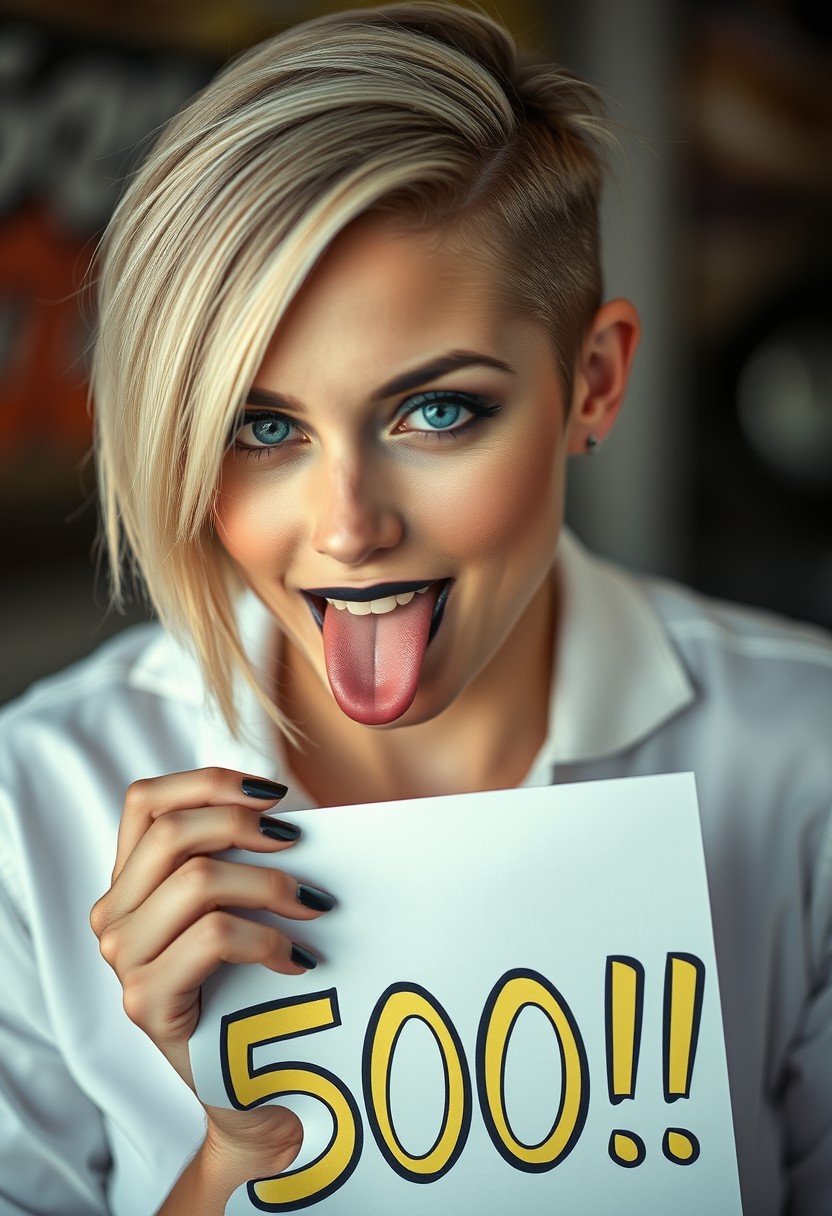 4K, best quality, masterpiece, extremely detailed, an extremely delicate and beautiful, dynamic, realistic anatomy, great lighting, perfect shading, professional shading, depth of field, blonde woman, 25 years old, smokey eyes makeup with black lipstick, blue eyes, pale skin, she is holding a sign which says "500 !!!", sticking out the tip of her tongue, wearing a white shirt, short hair shaved on one side with dark roots, full shot photo, uncropped, perfect face, perfect anatomy,cute, beautiful, perfect beauty,amazing beauty, pure genious, absolutely perfect, gentle, highly detailed, breathtaking, beautiful smile, Playboy style