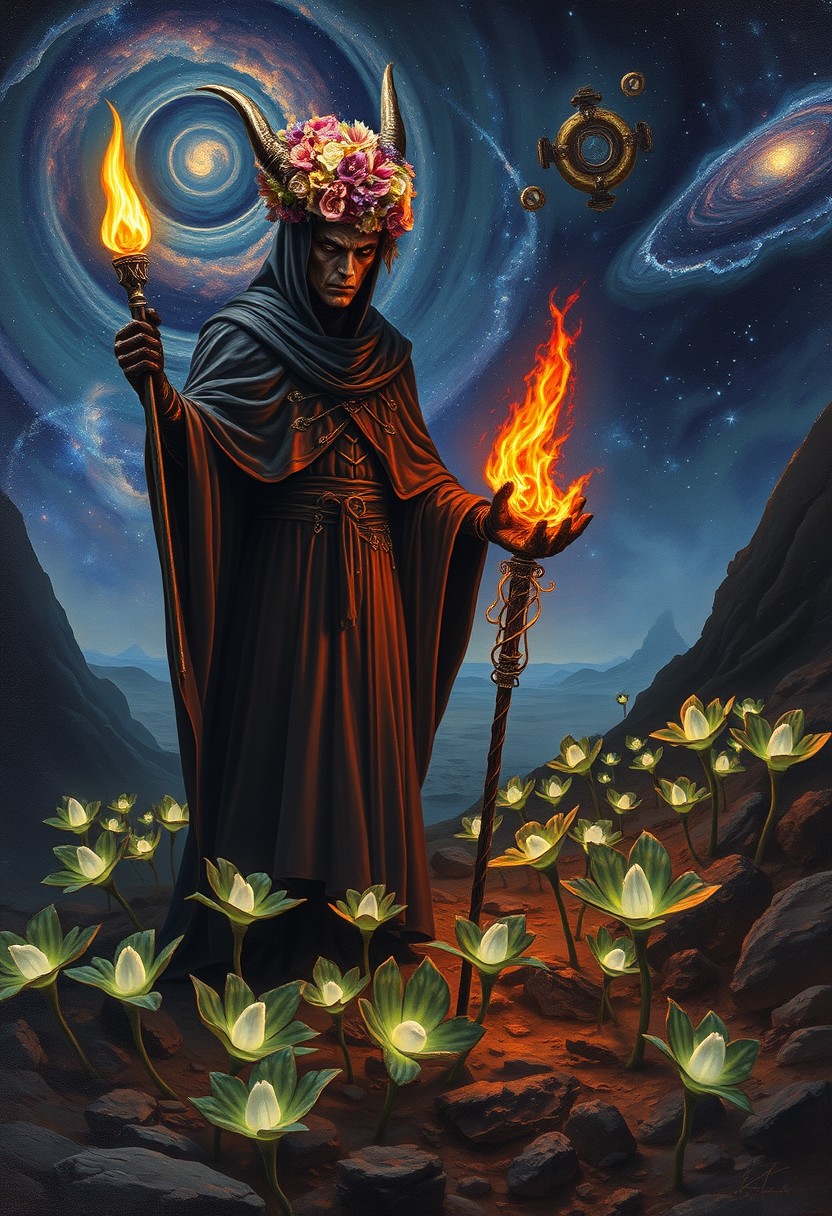 style of Ted Nasmith, Oil painting, by Jean-Franois Millet, by Gustave Courbet, by Jules Breton, traditional media, oil painting, famous artwork by (karl kopinski:1.2), fantasy style,thumbs,(ghost), On a desolate alien planet, a techno cultist clad in dark, crown of flowers, (fire staff on hand), shimmering robes tend to a garden of bioluminescent plants, their demonic features illuminated by the eerie glow, the night sky filled with swirling nebulae, realistic, dark fantasy, masterpiece, highly detailed, ever quest, old school rpg, , masterpiece,,
