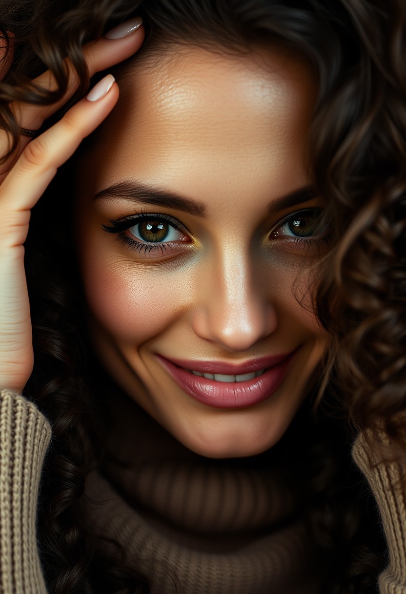 macro close-up shot of a cute women smiling (combing her hair with her hands:1.2) looking at viewerseductively, luxurious looking turtleneck, extremely long curly hair, seductiveconfident, skin pores, imperfections, natural, beautiful eyes, dark skin, black skin, (big hair), perfect teeth, (freckles:1.2), velus hairs, 100mm f/2.8 macro lens,, film grain, candid camera, color graded cinematic, 1960s vintage RAW photo, eye catchlights, catchlights in eyes, dramatic lighting, atmospheric lighting, rembrandt lighting,
