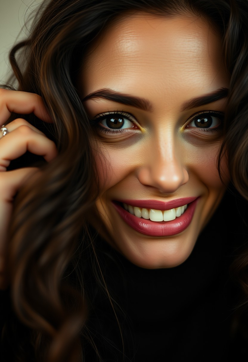 macro close-up shot of a cute women smiling (combing her hair with her hands:1.2) looking at viewerseductively, luxurious looking turtleneck, extremely long curly hair, seductiveconfident, skin pores, imperfections, natural, beautiful eyes, dark skin, black skin, (big hair), perfect teeth, (freckles:1.2), velus hairs, 100mm f/2.8 macro lens,, film grain, candid camera, color graded cinematic, 1960s vintage RAW photo, eye catchlights, catchlights in eyes, dramatic lighting, atmospheric lighting, rembrandt lighting,