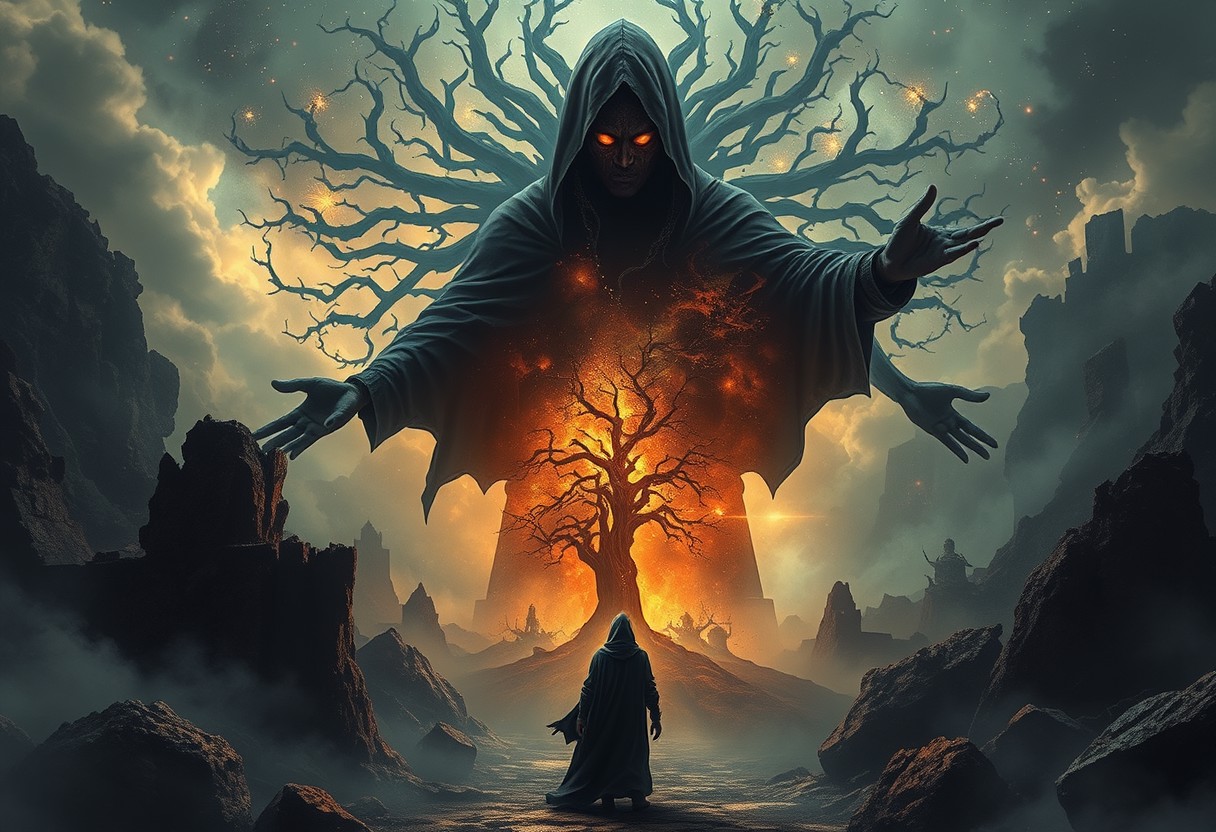A universe inside a dark cloaked figure within mysterious landscape in an unfathomable realm of fantastic creation inhabited by ancient shadows of a forgotten time beyond the gate of the gateless gate where life is limitless, light is shadow and shadow is light, eerie sense, horror, spark of the beginning, existence and nonexistence at once, ethereal, outstretched arms, behold the end of the beginning, inglorious glory to the dark one, betrayal of the ancient order, beware the 7headed beast, destroyer of the old ways, bearer of the unbearable, nightmarish, archaic runes, tree aging backwards, breath of the gods, ruins of a place unimagined, extreme intricate detail, photorealistic, beyond epic scene, fate discarded, unseeable face of god, the end is the beginning, the beginning is the end, man arises as god dies, as above so below, as below so above, emerald tablet, thoth, guardian and saboteur of existence, hopeless hope, ghosts of the unborn, conception of the inconceivable, cosmic well of imperceptible perception, evil aura, infinite emptiness, pillars of void, overwhelming subtlety, abstract sacred geometry, beams of readiness without intention, gift of doom, despair of the ages, hidden secret warnings from dead gods, carved by the conductor of unholy loneliness of time incarnate, consumed by the night itself, beautiful tragedy of hellish discovery, unraveling mist of unreal reality, ungodly seductive repulsion, proclaim the nameless name of collapsed eternity