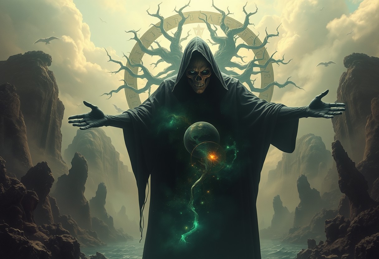 A universe inside a dark cloaked figure within mysterious landscape in an unfathomable realm of fantastic creation inhabited by ancient shadows of a forgotten time beyond the gate of the gateless gate where life is limitless, light is shadow and shadow is light, eerie sense, horror, spark of the beginning, existence and nonexistence at once, ethereal, outstretched arms, behold the end of the beginning, inglorious glory to the dark one, betrayal of the ancient order, beware the 7headed beast, destroyer of the old ways, bearer of the unbearable, nightmarish, archaic runes, tree aging backwards, breath of the gods, ruins of a place unimagined, extreme intricate detail, photorealistic, beyond epic scene, fate discarded, unseeable face of god, the end is the beginning, the beginning is the end, man arises as god dies, as above so below, as below so above, emerald tablet, thoth, guardian and saboteur of existence, hopeless hope, ghosts of the unborn, conception of the inconceivable, cosmic well of imperceptible perception, evil aura, infinite emptiness, pillars of void, overwhelming subtlety, abstract sacred geometry, beams of readiness without intention, gift of doom, despair of the ages, hidden secret warnings from dead gods, carved by the conductor of unholy loneliness of time incarnate, consumed by the night itself, beautiful tragedy of hellish discovery, unraveling mist of unreal reality, ungodly seductive repulsion, proclaim the nameless name of collapsed eternity