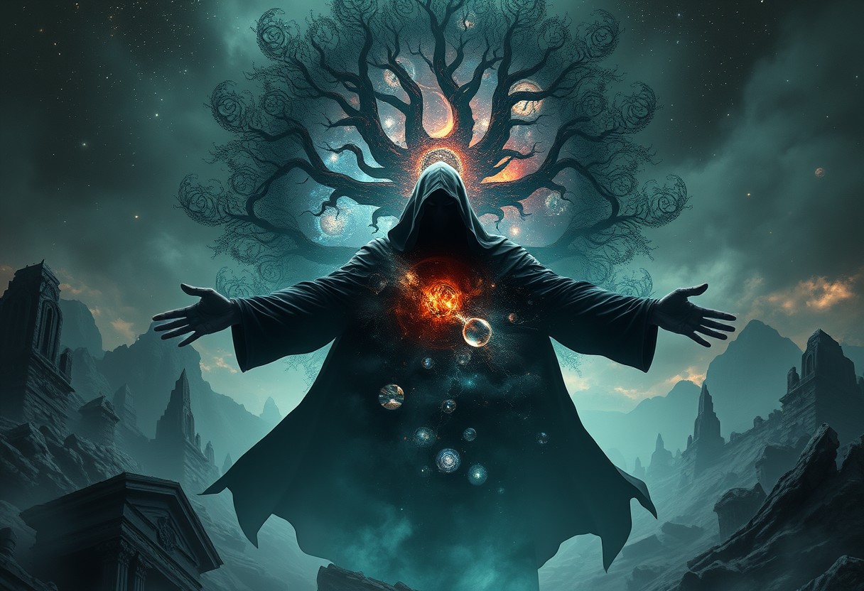 A universe inside a dark cloaked figure within mysterious landscape in an unfathomable realm of fantastic creation inhabited by ancient shadows of a forgotten time beyond the gate of the gateless gate where life is limitless, light is shadow and shadow is light, eerie sense, horror, spark of the beginning, existence and nonexistence at once, ethereal, outstretched arms, behold the end of the beginning, inglorious glory to the dark one, betrayal of the ancient order, beware the 7headed beast, destroyer of the old ways, bearer of the unbearable, nightmarish, archaic runes, tree aging backwards, breath of the gods, ruins of a place unimagined, extreme intricate detail, photorealistic, beyond epic scene, fate discarded, unseeable face of god, the end is the beginning, the beginning is the end, man arises as god dies, as above so below, as below so above, emerald tablet, thoth, guardian and saboteur of existence, hopeless hope, ghosts of the unborn, conception of the inconceivable, cosmic well of imperceptible perception, evil aura, infinite emptiness, pillars of void, overwhelming subtlety, abstract sacred geometry, beams of readiness without intention, gift of doom, despair of the ages, hidden secret warnings from dead gods, carved by the conductor of unholy loneliness of time incarnate, consumed by the night itself, beautiful tragedy of hellish discovery, unraveling mist of unreal reality, philosophers stone