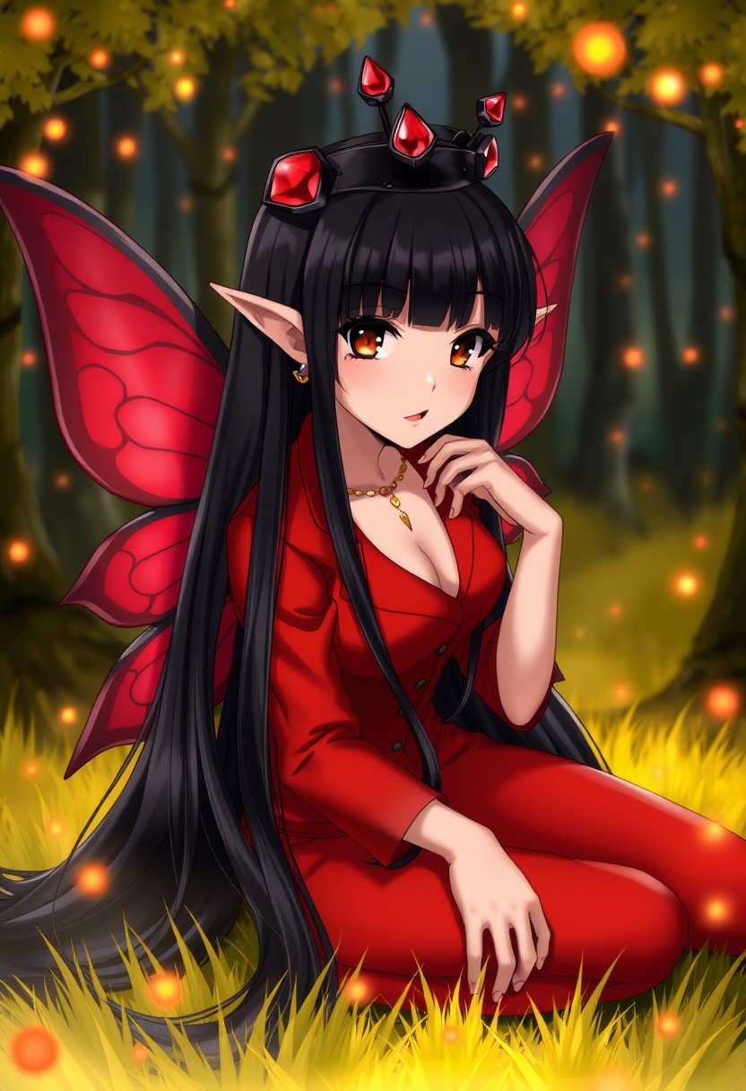 score_9, score_8_up, score_7_up, score_6_up, score_5_up, score_4_up, dynamic scene, 1 fairy girl, long black hair, sitting, hand on grass, very long hair, bangs (black crown with red stones on head: 1.5), head over shoulder, brown eyes, makeup, red lips, plump lips, big red butterfly wings on back, red suit, slim, sexy, seductive , sensitive face, surprised, raised eyebrows, erotic emotions, gold ear jewelry, gold neck jewelry, elf ears, yellow-green forest, night, firefly lights, many fireflies, many small red lights in the background (full body: 1 ,5)