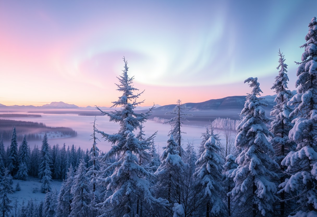 Artistic photograph, arctic landscape at dusk, aurora borealis swirling above, pastel colors of pink, blue, and green, snow-covered trees in the foreground, frozen river in the background, misty atmosphere, soft focus, warm lighting, DSLR, high resolution, detailed textures, intricate details, cinematic look.