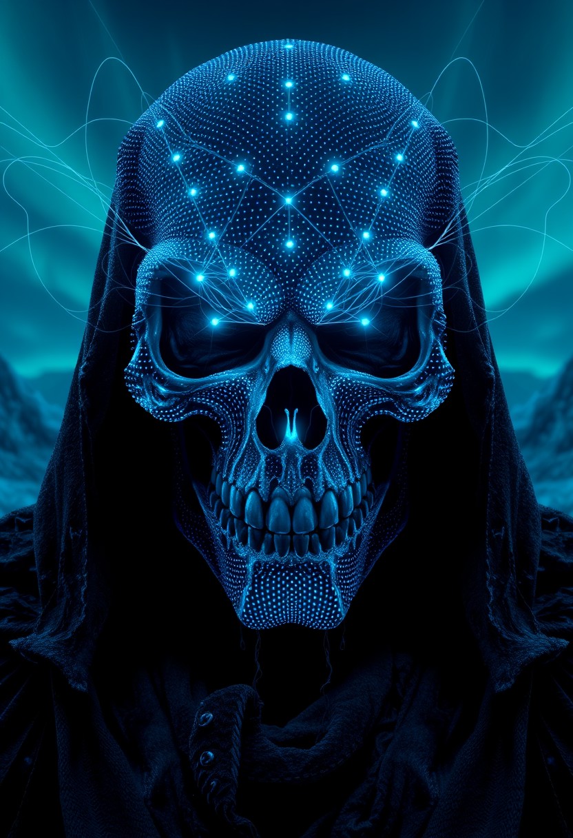 A symmetric portrait of Masters of the universe Skeletor, features dissolving into frozen magic thin, luminescent blue lines. Weighted Voronoi stippling and laser caustics create a network, transitioning from hyperrealistic detail to abstract, quantum-inspired forms. Ethereal hues blend, evoking existential transition and mystery. Close-up on face, evil skull partially visible. Set against a twilight arctic backdrop, icy winds ripple through his tattered robes. Rendered in a fusion of photorealism and digital surrealism, the scene is illuminated by ghostly Northern Lights. Emphasis on cold, menacing atmosphere, invoking Nordic myths
