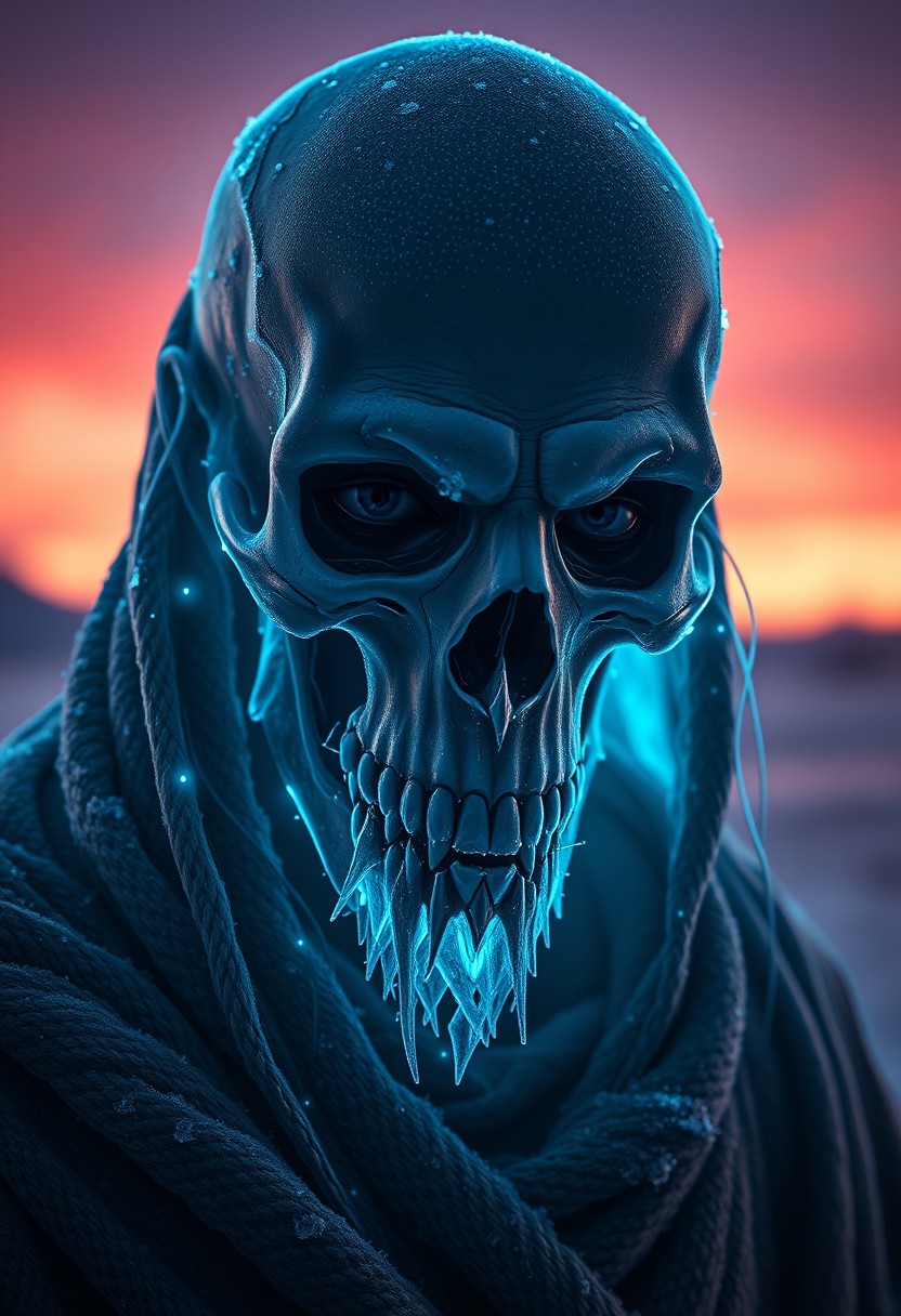 A symmetric portrait of a male, evil frozen Skeletor, features dissolving into frozen magic thin, luminescent blue lines. Weighted Voronoi stippling and laser caustics create a network, transitioning from hyperrealistic detail to abstract, quantum-inspired forms. Ethereal hues blend, evoking existential transition and mystery. Close-up on face, evil skull partially visible. Set against a twilight arctic backdrop, icy winds ripple through his tattered robes. Rendered in a fusion of photorealism and digital surrealism, the scene is illuminated by ghostly Northern Lights. Emphasis on cold, menacing atmosphere, invoking Nordic myths