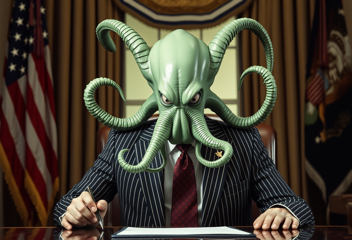 president cthulu in a sharp pin striped suit posing for presidential portrait in the oval office, real photograph, signing bill, ominous evil, empty eyes