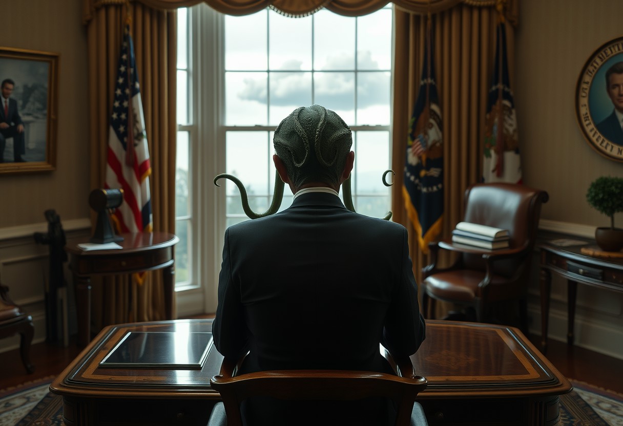 cthulu for president, oval office, mushroom cloud outside window, real photograph, inspector gadget style, photorealistic, correct hands, correct fingers, presidential seal, vote button, campaign photo, election, elegant scene, facing away, sitting