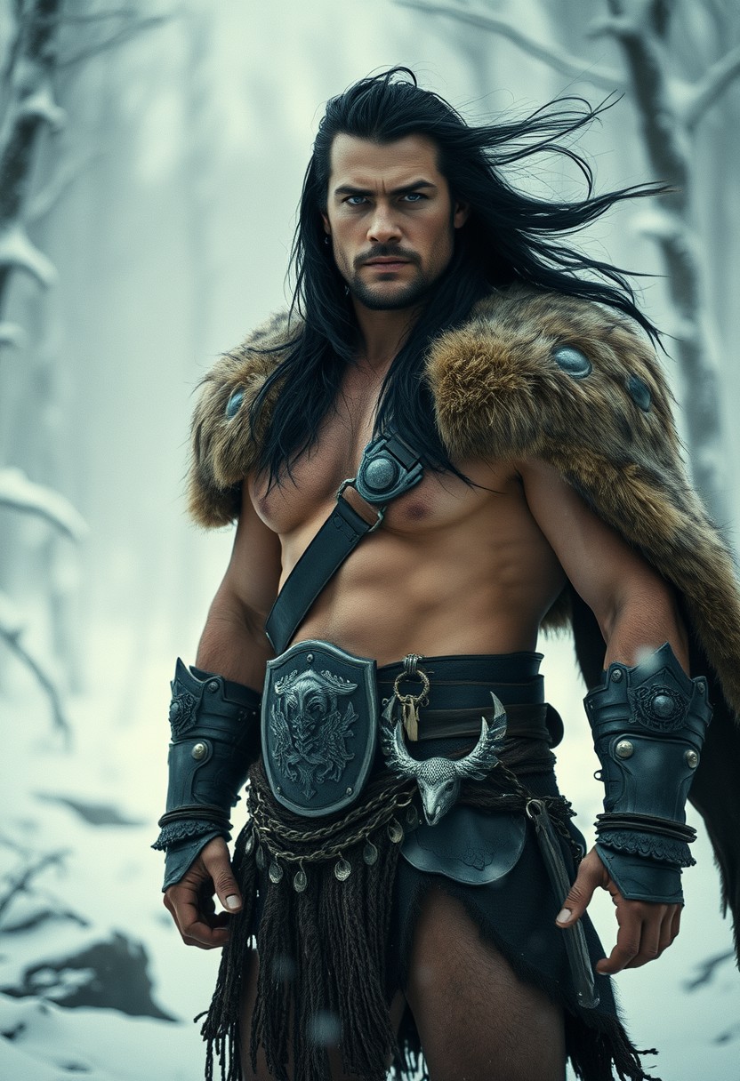 Full shot, standing pose, old grainy analog photo, bad image quality, heavy film grain, monochrome with low key color spots, Create an action scene featuring Conan the barbarian in a apocalyptic battlefield , standing in the midst of an ice forest. He wears a fur cape and an iron armour. Blue eyes. Hyper muscular, vascular body. Dirt skin. He is calm and cool. His long black hair adding to the dramatic effect. Wind, snow. The scene is vibrant with atmospheric lighting and cinematic composition.