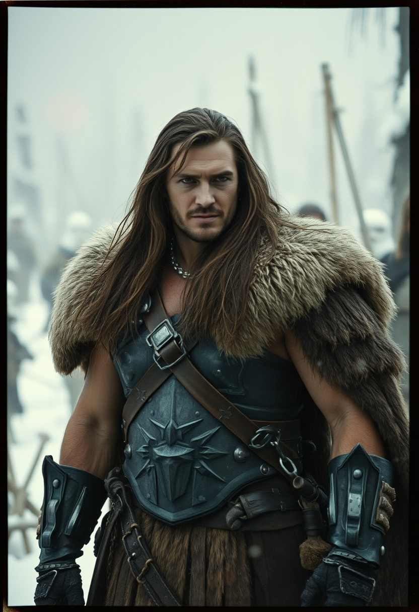 upper body closeup shot, old grainy analog photo, bad image quality, heavy film grain, monochrome with low key color spots, Create an action scene featuring Conan the barbarian in a apocalyptic battlefield , standing in the midst of an ice forest. He wears a fur cape and an iron armour. He is calm and cool. His long hair adding to the dramatic effect. The scene is vibrant with atmospheric lighting and cinematic composition.