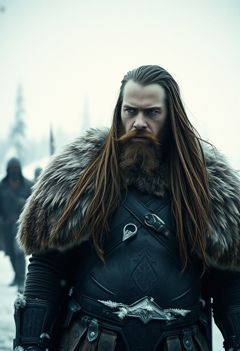 upper body closeup shot, old grainy analog photo, bad image quality, heavy film grain, monochrome with low key color spots, Create an action scene featuring a barbarian in a apocalyptic battlefield , standing in the midst of an ice forest. He wears a fur cape and an iron armour. He is calm and cool. His long hair adding to the dramatic effect. The scene is vibrant with atmospheric lighting and cinematic composition.
