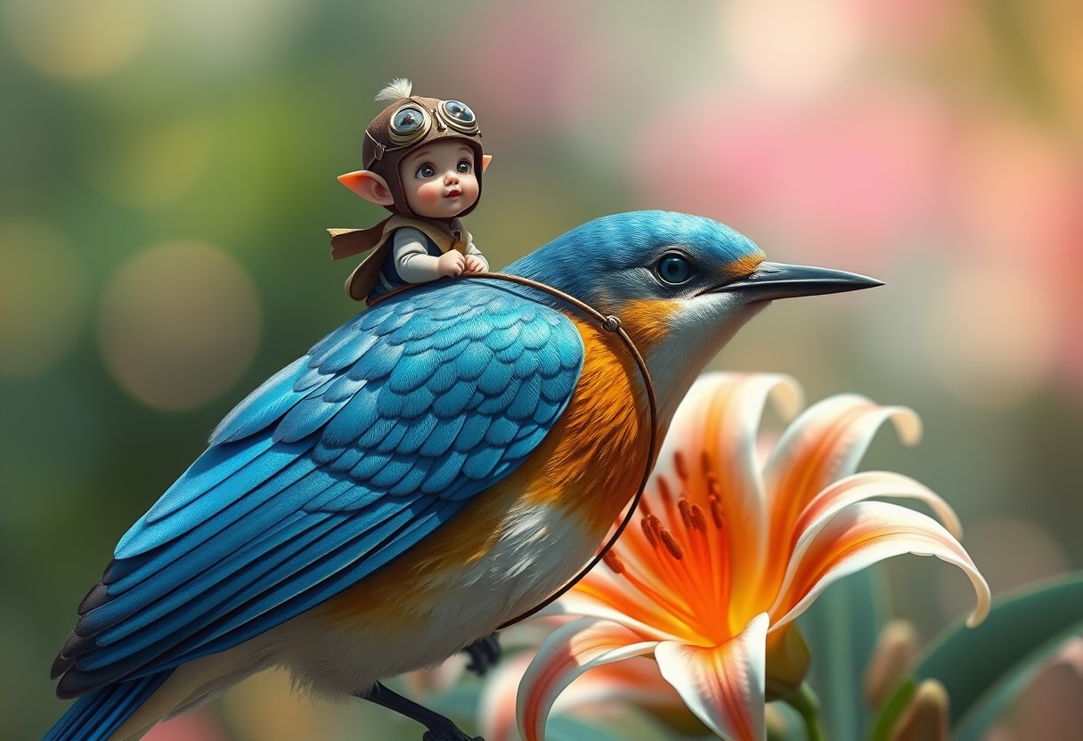 a tiny goblin pilot riding on the back of a bluebird, reins, the bird's feathers have an iridescent shine, bright lily flowers, bokeh, in the style of a fantasy painting